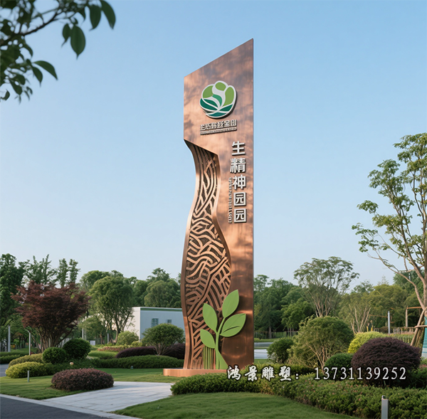 这座标志性雕塑采用仿古铜色金属材质铸造,整体造型犹如一株破土而出的新芽,以流畅的有机线条勾勒出蓬勃向上的生命张力。表面经过特殊氧化处理呈现出典雅的青铜质感,在阳光下折射出温润的光泽,既彰显现代工艺的精湛,又蕴含着时光沉淀的厚重感。雕塑主体由三组螺旋上升的金属叶片构成,叶片边缘采用镂空雕刻工艺,将园区代表性植物纹样以抽象化手法融入其中,当微风拂过时,这些精妙的镂空纹理会在地面投射出变幻的光影图案。基座采用层叠式花岗岩砌筑,侧面镌刻着象征生态循环的水波纹浮雕,与主体雕塑形成刚柔并济的视觉对话。特别设计的泛光照明系统使雕塑在夜间呈现出琥珀色的通透光晕,金属叶片间的缝隙犹如呼吸般明暗交替,赋予静态雕塑以生命的韵律。整体高度控制在5.8米,既保持视觉冲击力又不失亲和感,其螺旋上升的动势引导游客视线自然延伸至后方生态林带,完美诠释了"人与自然共生"的设计哲学。